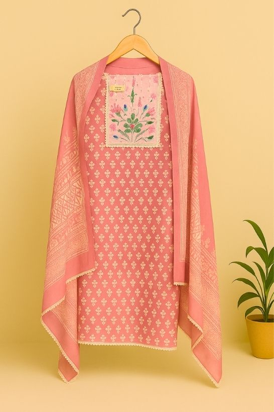 Elegant coral pink unstitched suit set featuring delicate floral embroidery on the neckline, traditional printed dupatta, and coordinated patterned bottom fabric — perfect for festive and graceful daily wear.