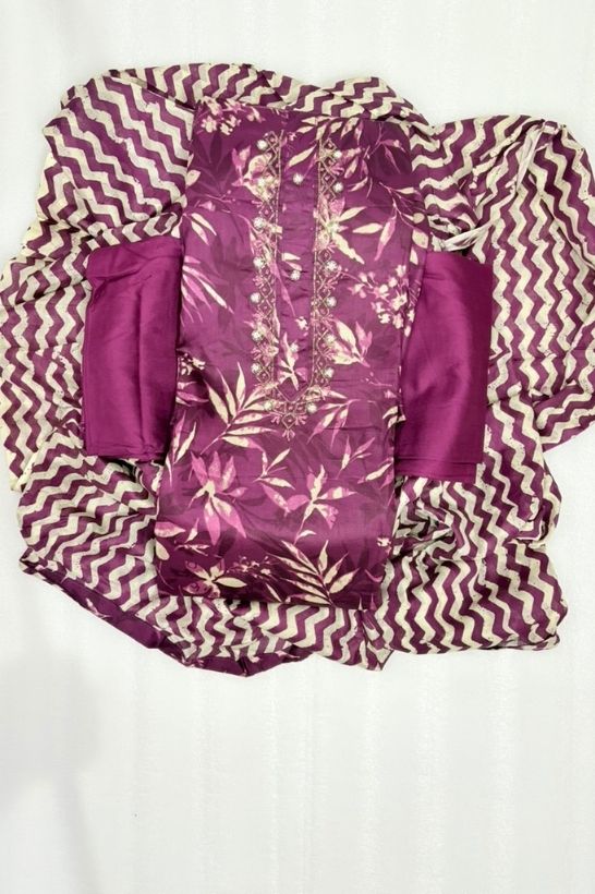 Elevate your everyday ethnic style with this beautifully designed deep plum unstitched suit set. The kurta fabric showcases delicate floral prints spread across a rich plum base, creating a graceful and timeless look.