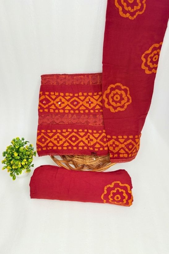 Vibrant maroon unstitched suit set featuring bold mustard ethnic prints and border detailing, paired with a matching dupatta and solid bottom fabric — perfect for festive and casual traditional wear.