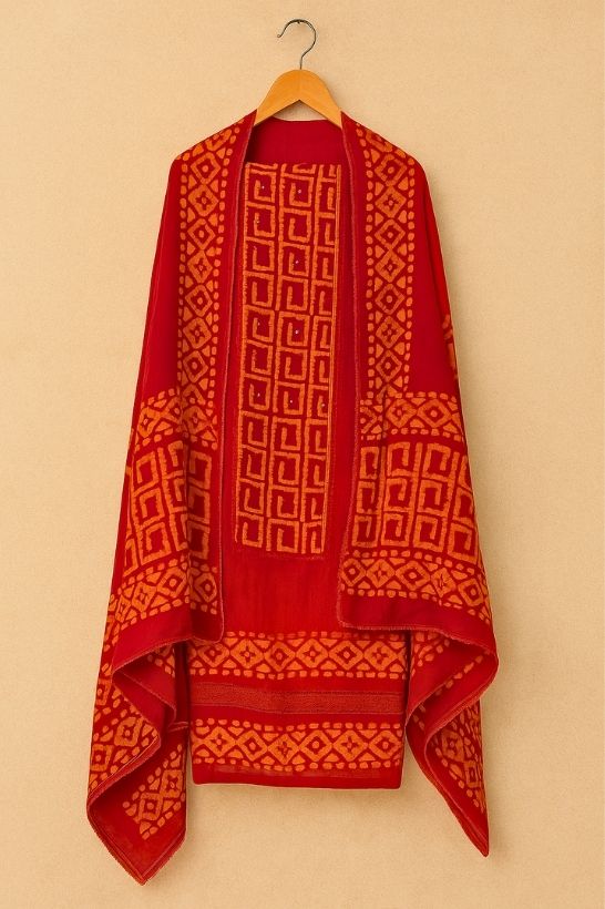 Add a bold traditional touch to your ethnic collection with this striking maroon and mustard unstitched suit set. Designed with eye-catching geometric and floral-inspired prints, this ensemble beautifully blends heritage patterns with contemporary appeal.