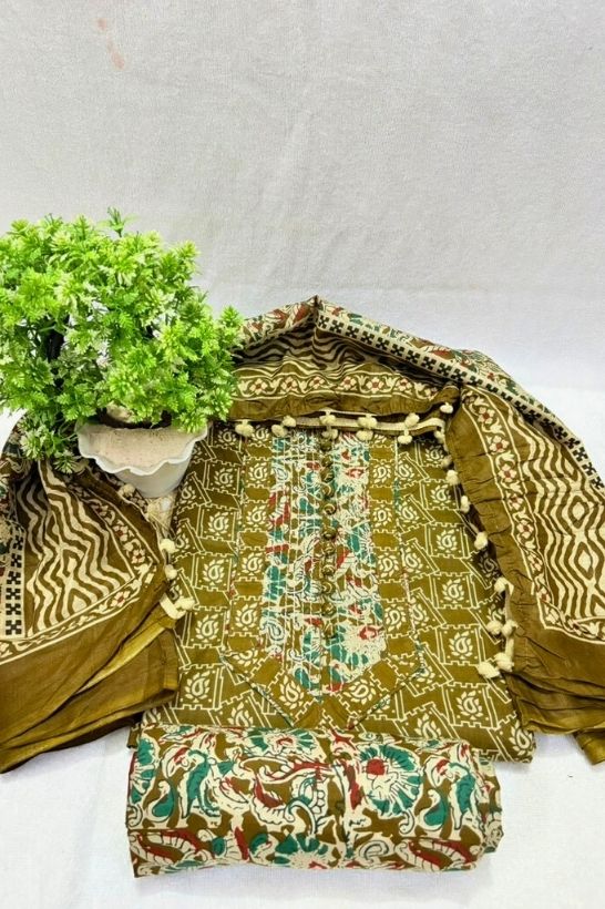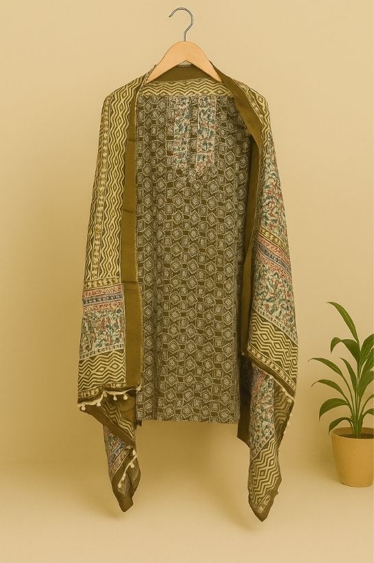 Elegant olive green unstitched suit set featuring intricate traditional patterns, paired with a beautifully printed dupatta for a refined and earthy ethnic look.