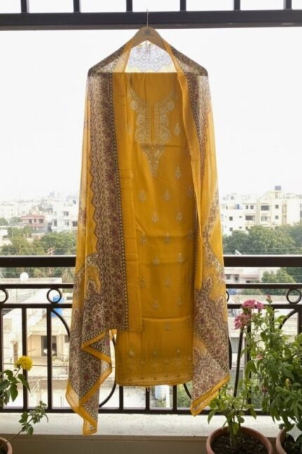 Paired with a matching bottom fabric, this unstitched set allows you to tailor it to your desired fit and style, making it both comfortable and customizable.