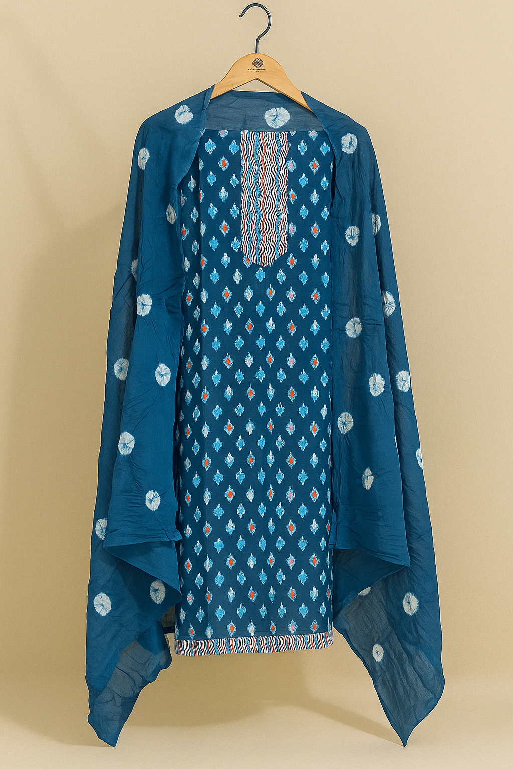 Color: Rich Indigo Blue with multicolor ikat motifs