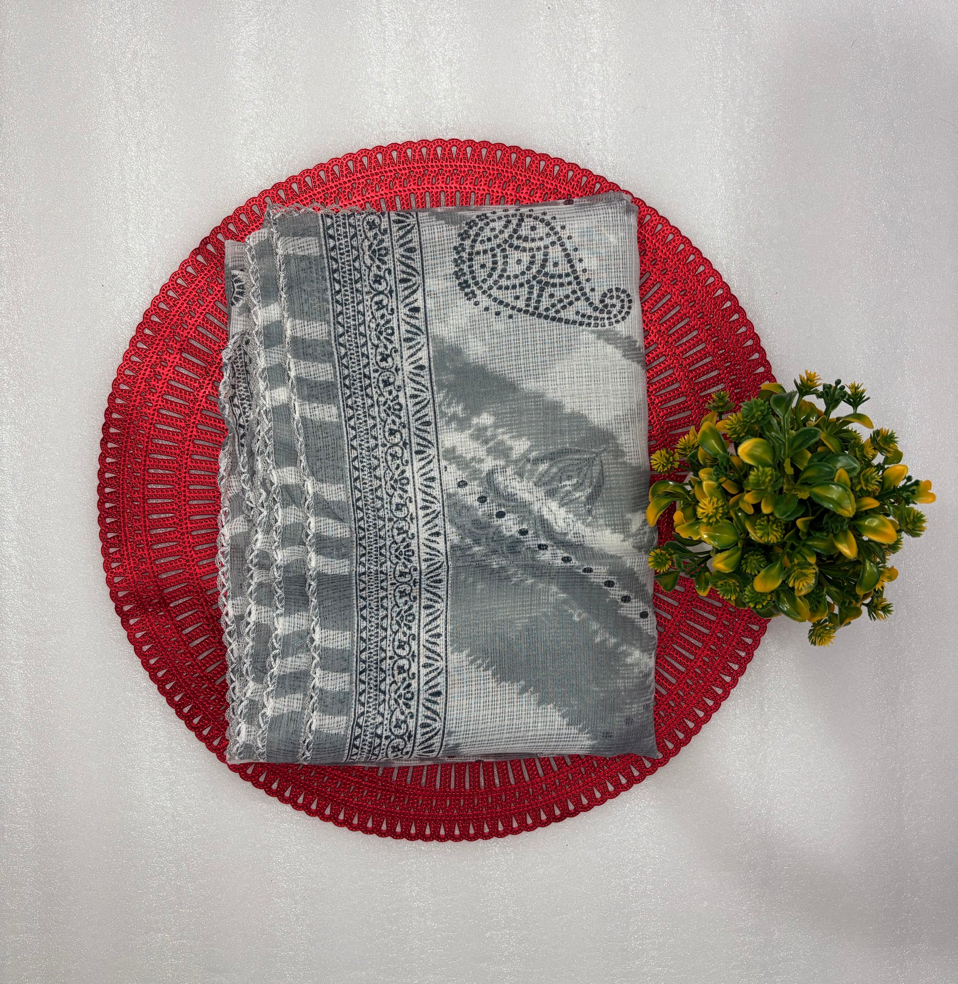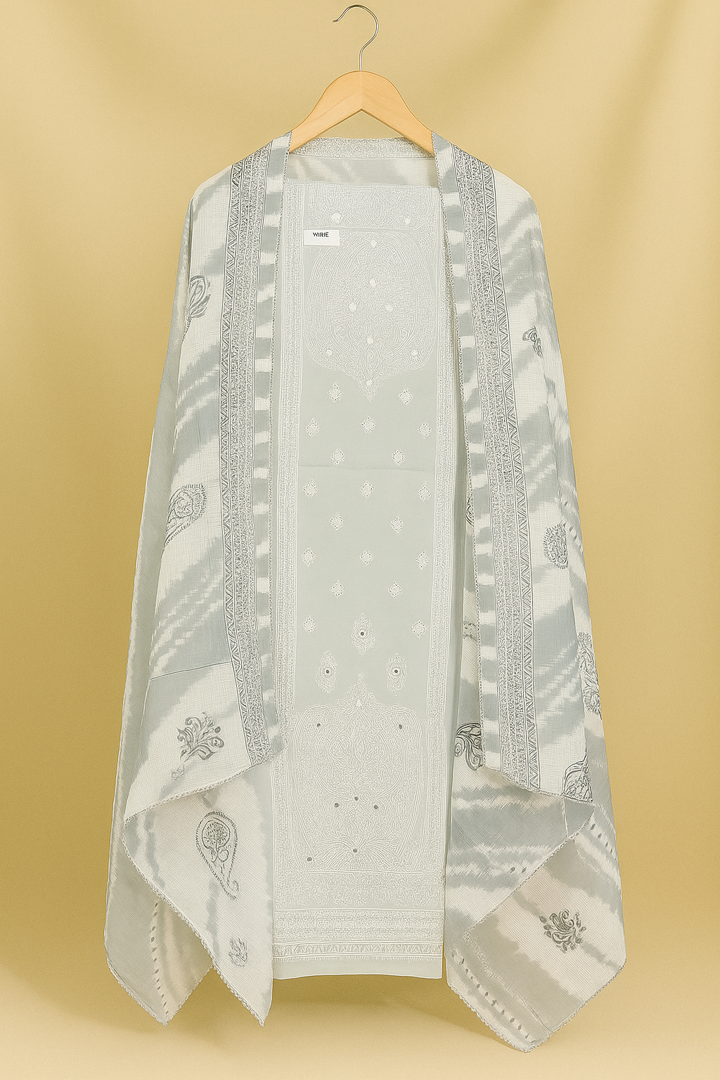 Grace meets elegance in this soft grey unstitched suit set, ideal for lovers of understated luxury. The kurta showcases intricate white thread embroidery in traditional motifs, lending a refined charm. Complemented by a beautifully woven dupatta featuring paisley and floral detailing with delicate striped borders, this ensemble is a perfect pick for intimate gatherings, office wear, or serene festive looks.