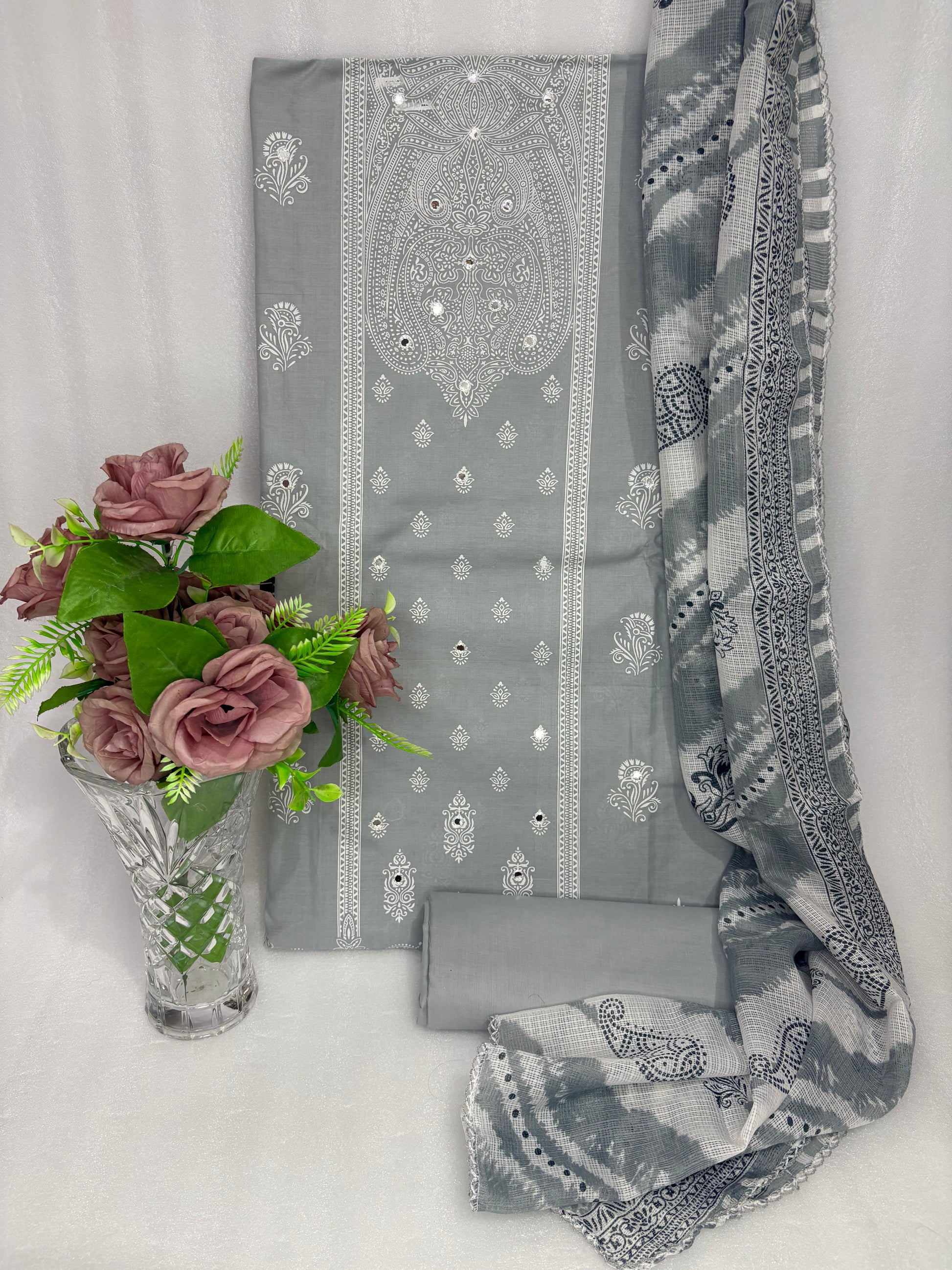 Soft Grey Embroidered Unstitched Suit with Subtle Paisley Dupatta